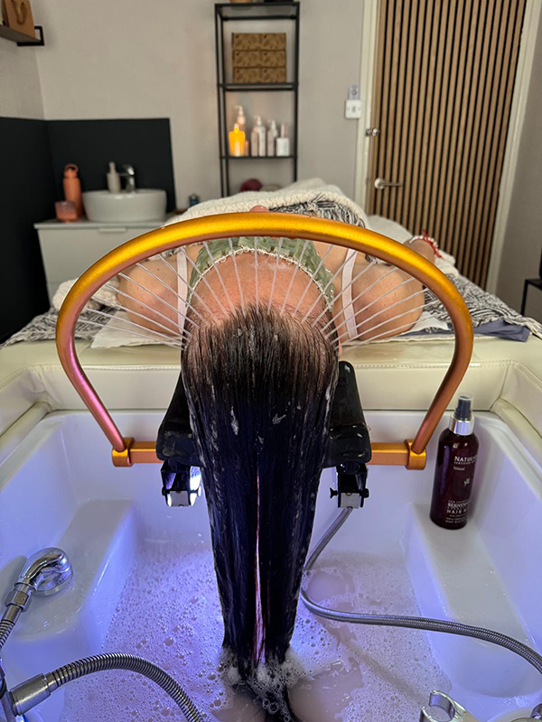 Shampoo, deep shampoo, massage combs, scalp exfoliator, hair mask, comb massage, scalp massage, conditioner and replenishing spray. With the head spa water fountain. With the added relaxation the monu aromatic facial.